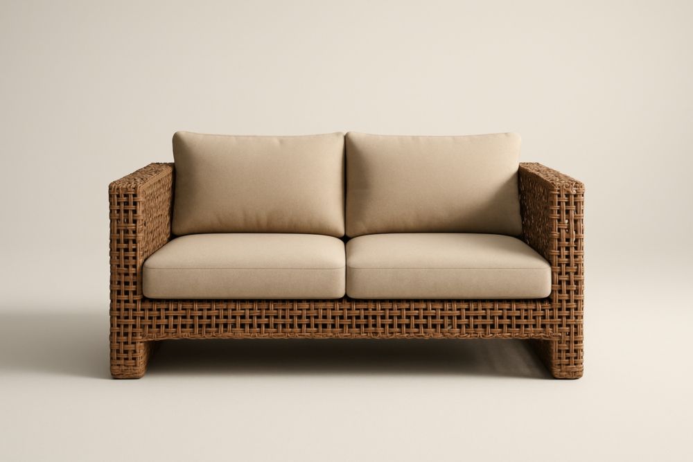 Divano da giardino a due posti in rattan con cuscini in tessuto poliestere beige