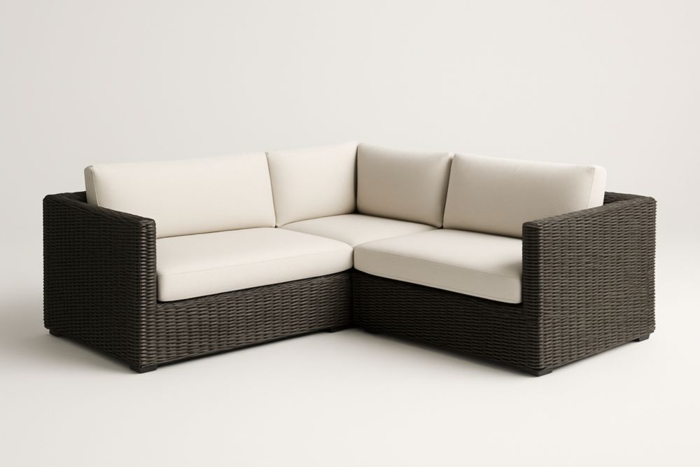 Divano angolare modulare da giardino in rattan con cuscini bianchi