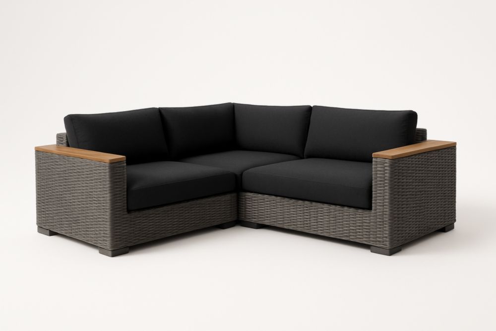 Divano angolare da giardino in rattan con braccioli in legno massello e cuscini neri