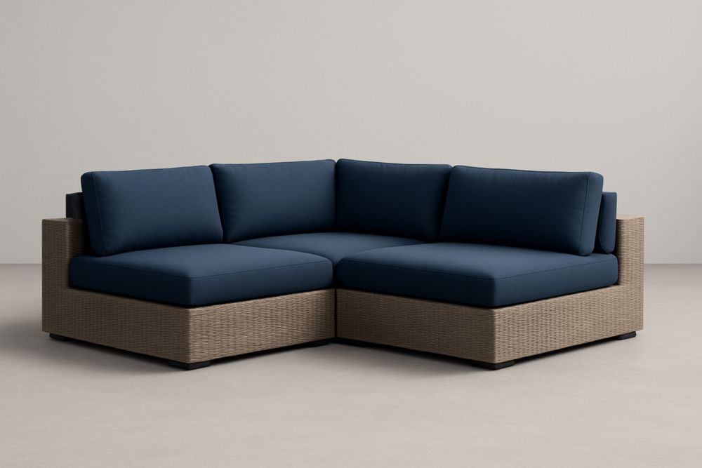 Divano angolare da giardino in rattan sintetico con cuscini blu
