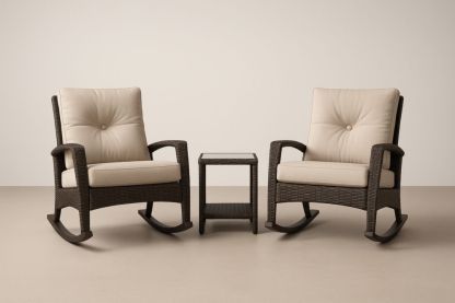 Set Sedie a Dondolo in Rattan Sintetico con Tavolino in Vetro Marrone/Beige